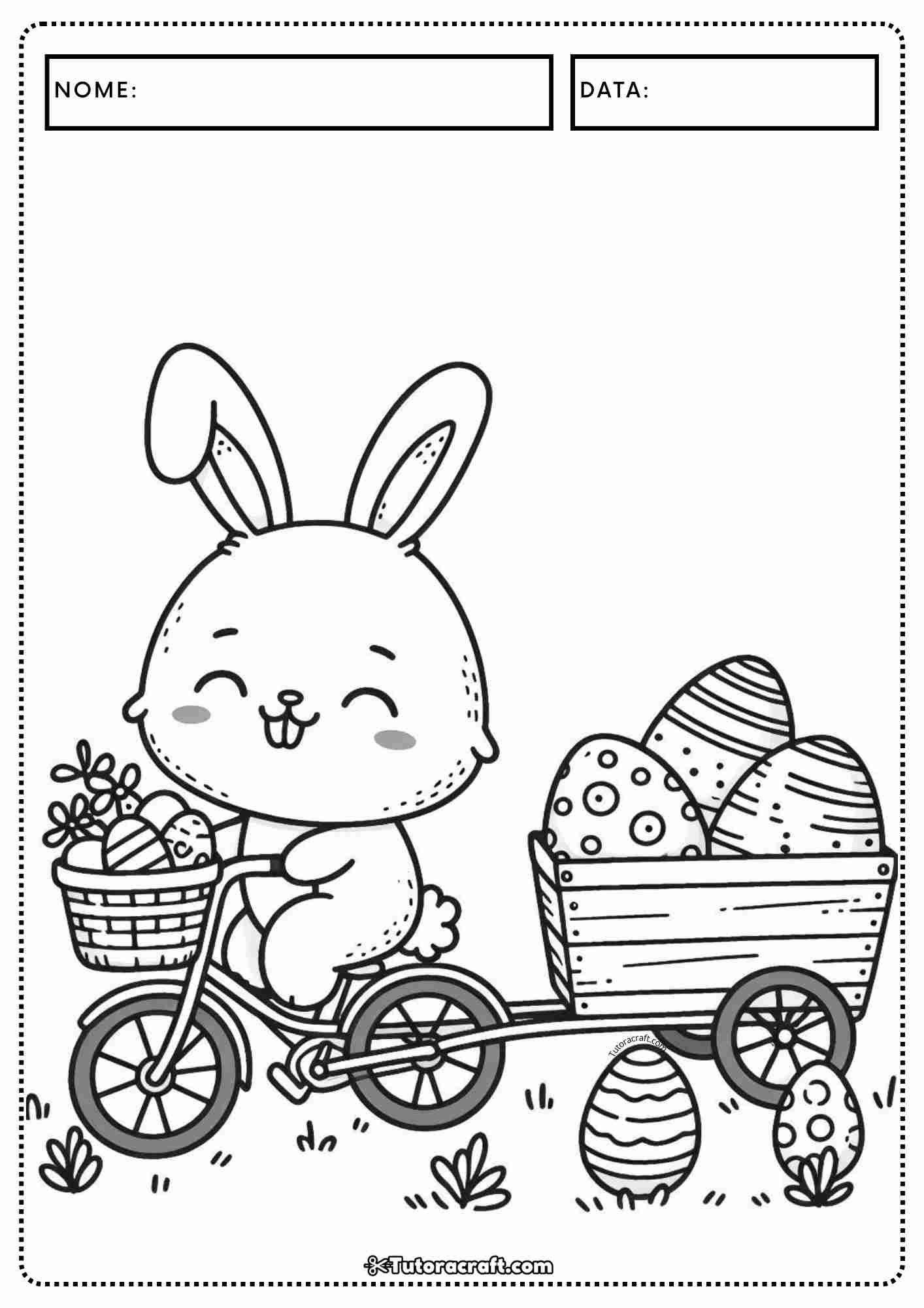 | 28 Desenho de Páscoa para colorir: coelhinho andando de bicicleta com ovos na cesta |